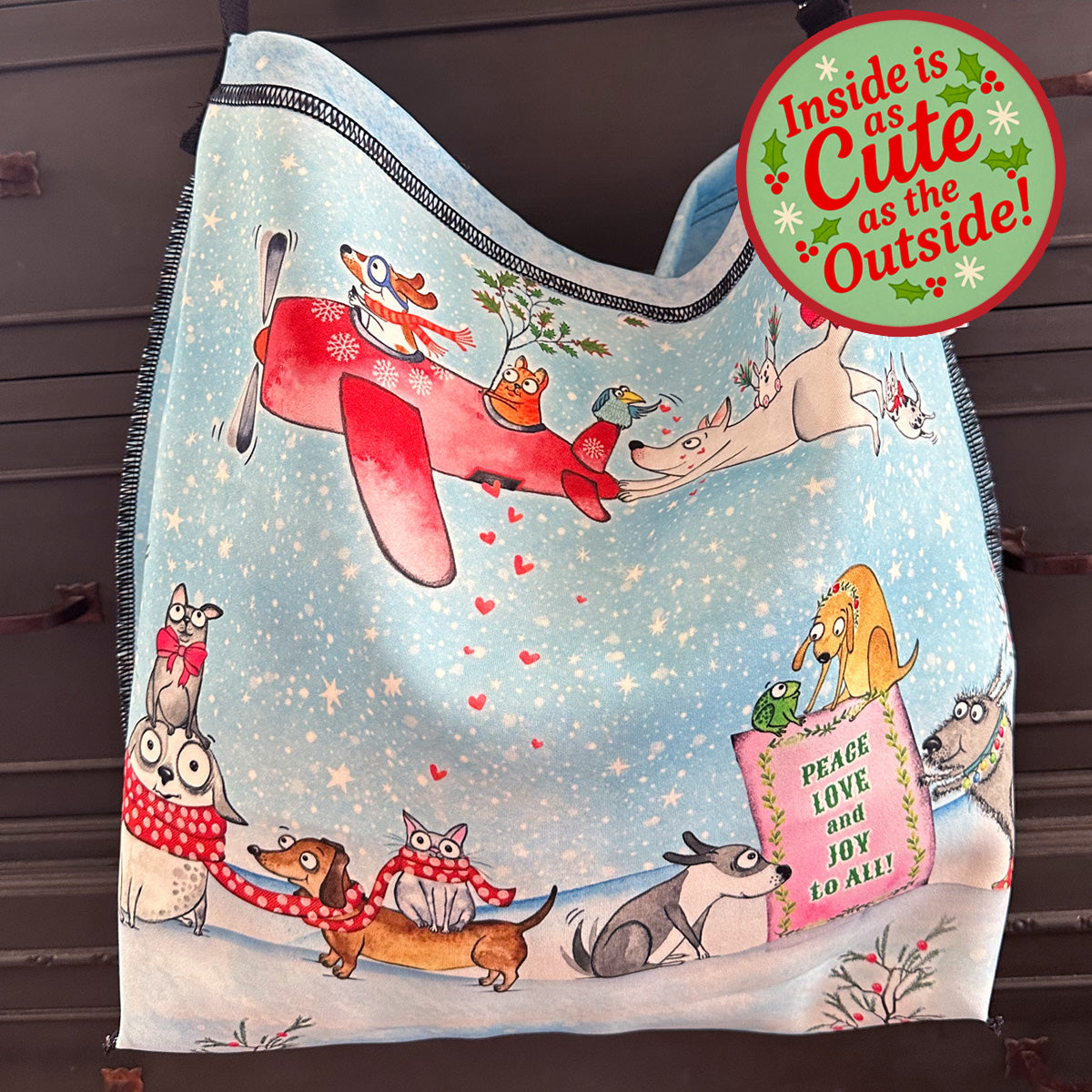 This handbag is super light, but sturdy. It is made from supple neoprene that stretches to accommodate a little or a lot! Comes in a cute cloth storage bag (design will vary).I searched high and lo' for this unique bag. It is extra special because it is printed on the inside, too! My whole life I've coveted fashion that is as beautiful on the inside as it is on the outside—the lining of this bag is sprinkled with positive words and my cute critters on a vintage oil painting. Every time you reach into your bag you'll be happy! Artwork on both sides of handbag.