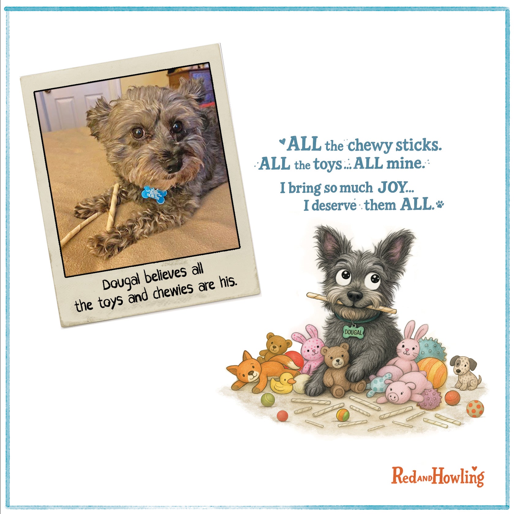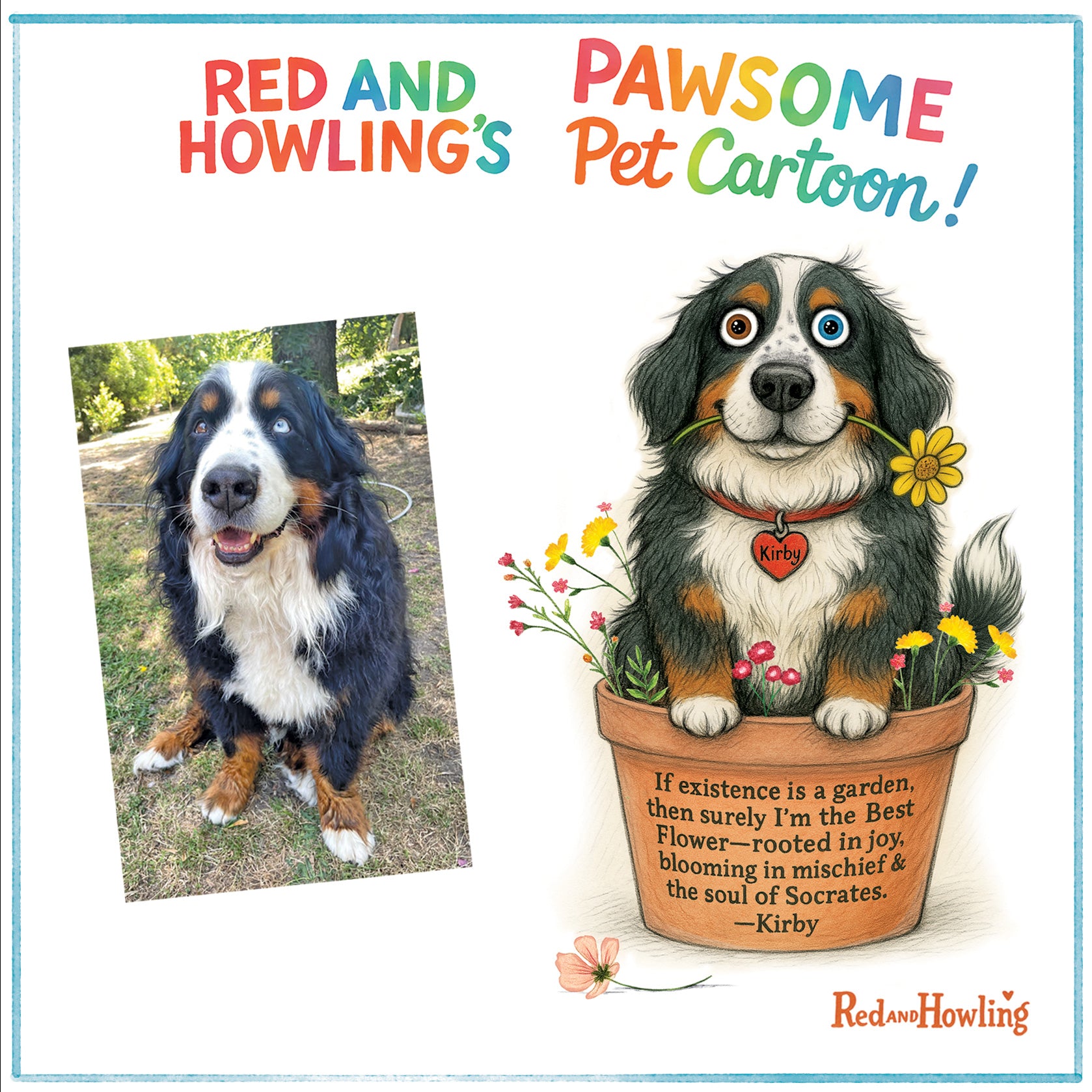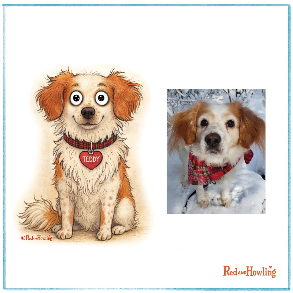 Single panel custom Red and Howling cartoon starring your pet. Cartoon will be based on details you share with me about your fur baby.